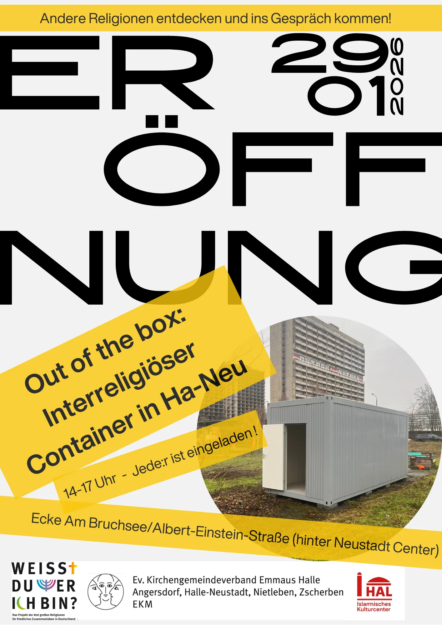Um Ihnen und euch unseren Container vorzustellen, laden wir herzlich zur Eröffnung ein: Am Donnerstag, den 29.01.26 zwischen 14-17 Uhr. Vertreter:innen der verschiedenen Religionsgemeinschaften werden vor Ort und für das leibliche Wohl wird gesorgt sein.